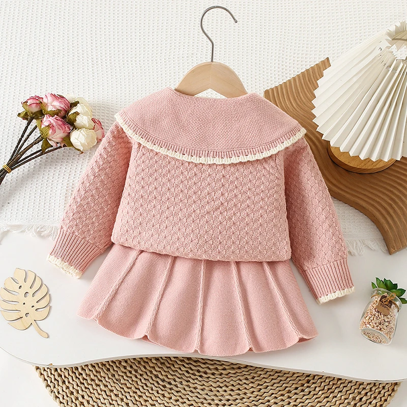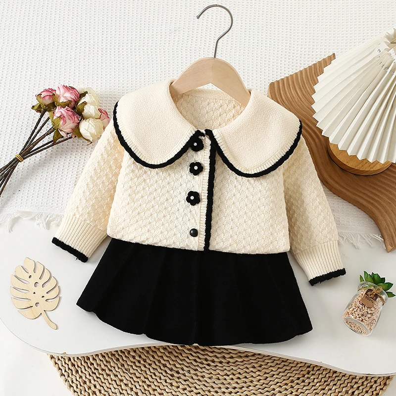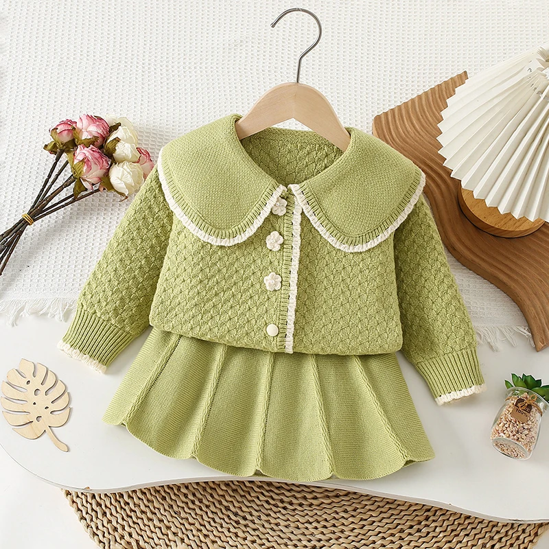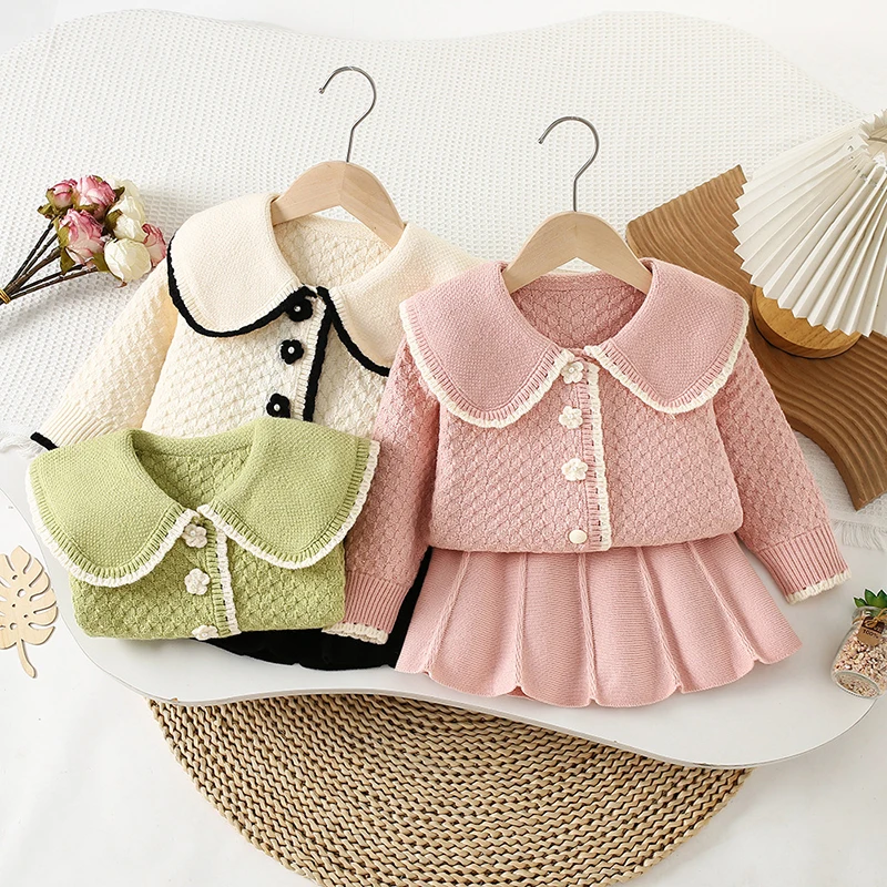 “Girls’ Autumn/Winter Knit Outfit – Floral Button Cardigan